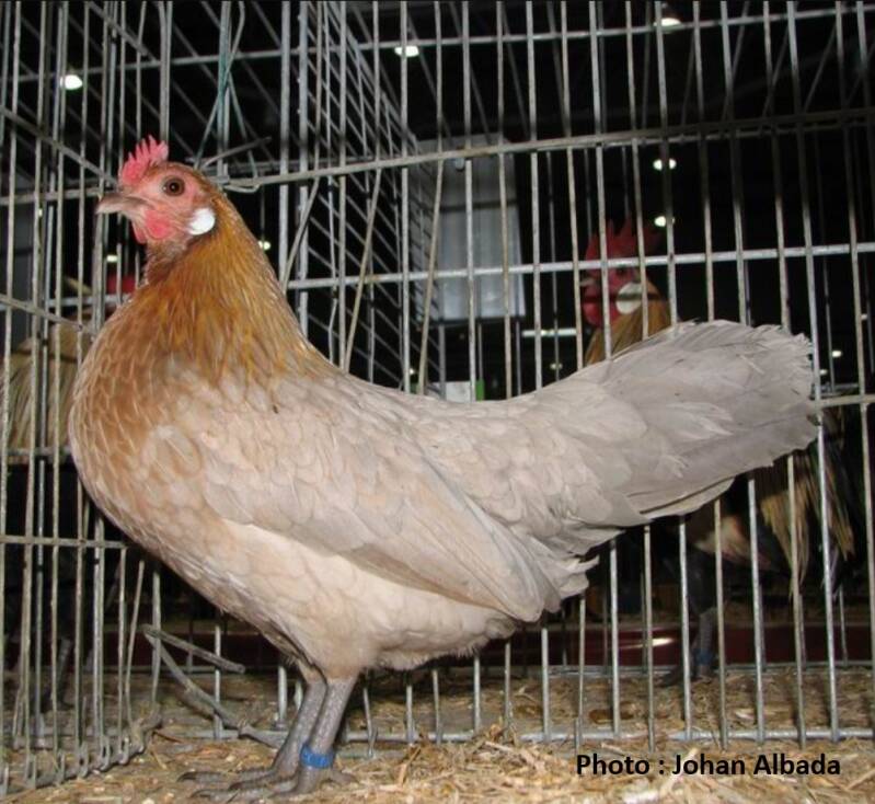 Saddle: hackle orange to ligh-orange with more or less distinct blue shaft-stripe pattern, absence of pattern is not considered a fault; a slightly deeper shade in the saddle-hackle than in the neck-hackle is permitted.