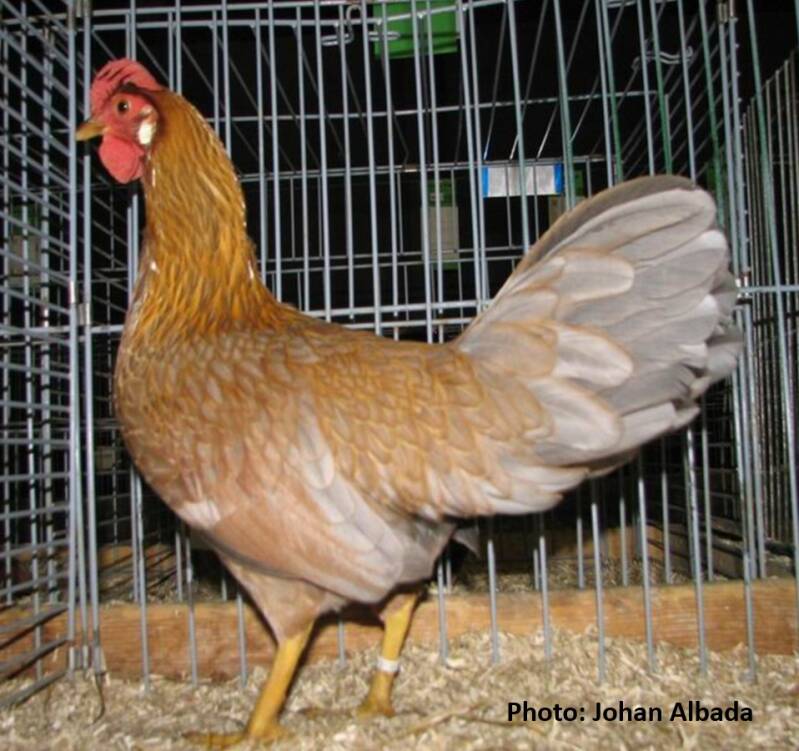 Shoulders, back, saddle,wings and thighs: even yellow-brown ground color with a fine, regularly distributed blue peppering and a yellow-white shaft; each feather has a sharp, evenly widthwise, shiny gold flitter edge.