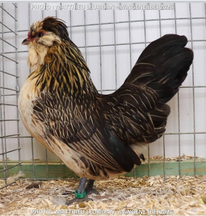 Shoulders and back: each feather has a green-glossy black triangular center with warm gold-brown barbs; back-feathers with bright-gold shaft; back-feathers broad under the hackle, become narrower towards the back and longer towards the lower back.