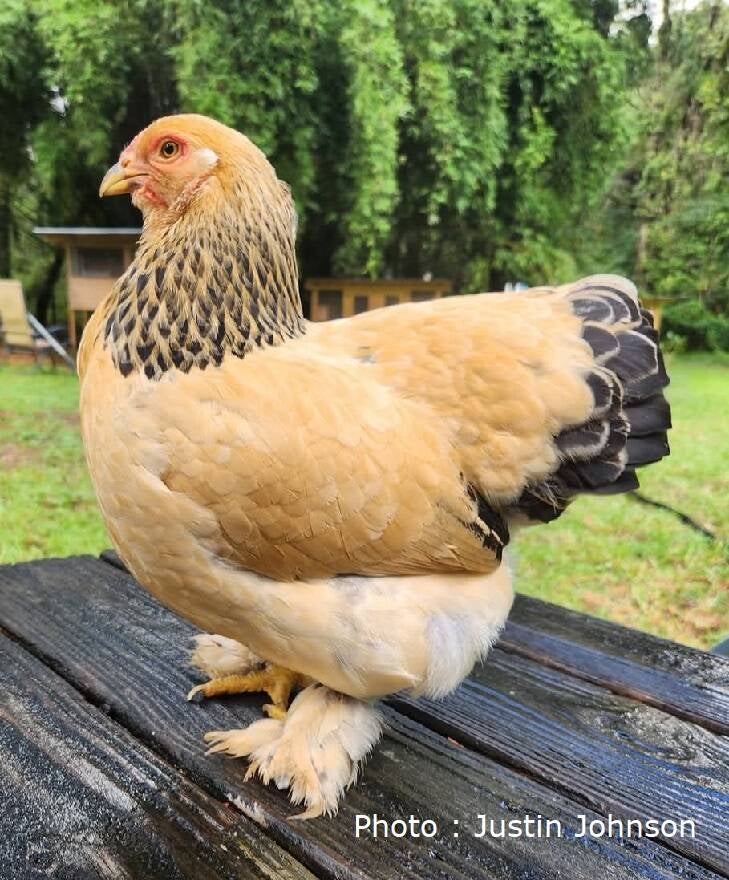 Back and saddle feathers: upper plumage buff, between the shoulders below the neck-hackle buff and blue; saddle-hackle buff with a black shaft stripe that extends from the tip of the feather no further than halfway down the feather.
