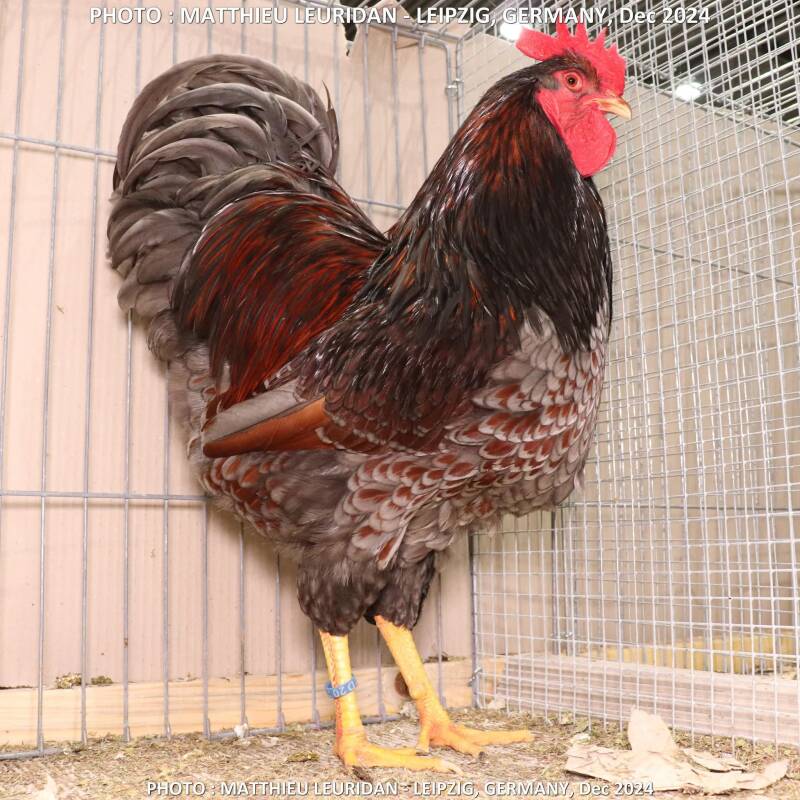 Shoulder coverts Wings: shoulder blue; coloured and marked like the neck hackles, the bright blue edging is broader on the shoulders and more edging at the feather edge is permitted; wing band formed by two rows of bright blue wing coverts, edging pattern in the wing band is permitted; large flight feathers blue, with the exception of a narrow reddish-brown edging at the outer vane; small flight feathers inner vane blue, outer vane reddish-brown preferably with a narrow blue border along the outer edge of the feather, forming a reddish-brown wing triangle with a narrow blue border edge when the wing is closed.