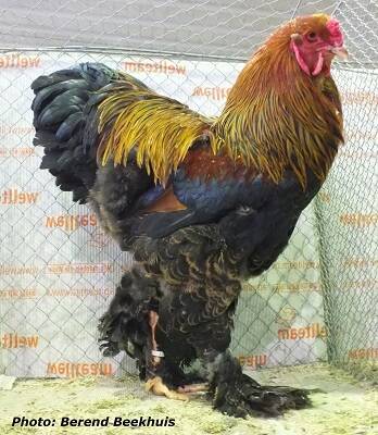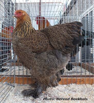 Neck: hackle orange-yellow, starting approximately at the transition of head and neck, each feather provided with a broad greenish glossy black shaft stripe (slightly laced with orange-brown), running parallel to the feather edge and ending in a point close to the feather end. Front of the neck similar to the breast.