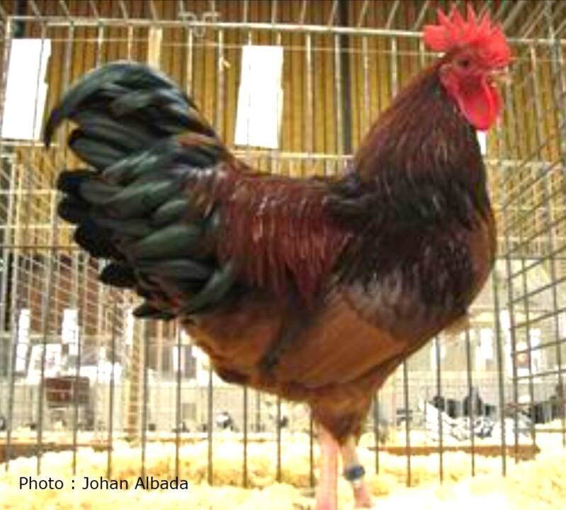 Insufficient pattern in the neck-hackle. Broad and indistinct deep-red edging on the tail-coverts Strong presence of black in the areas that should be deep-red on the surface, such as the wing-coverts, breast and the body. Broken shaft stripe pattern. Deviations in color depth in different feather groups.