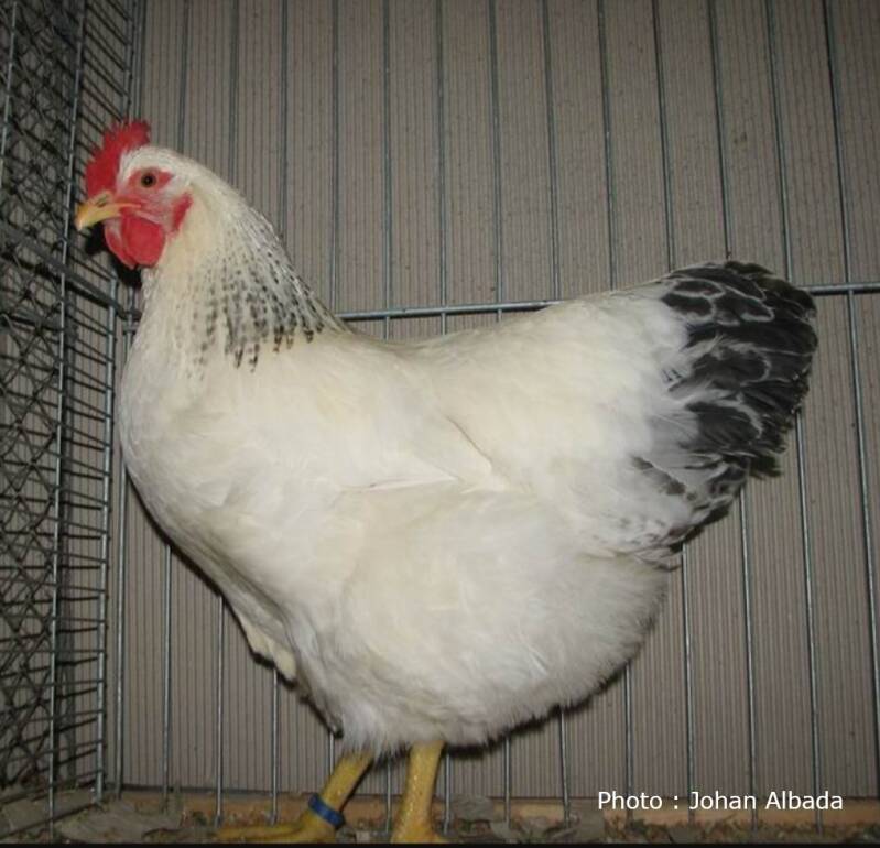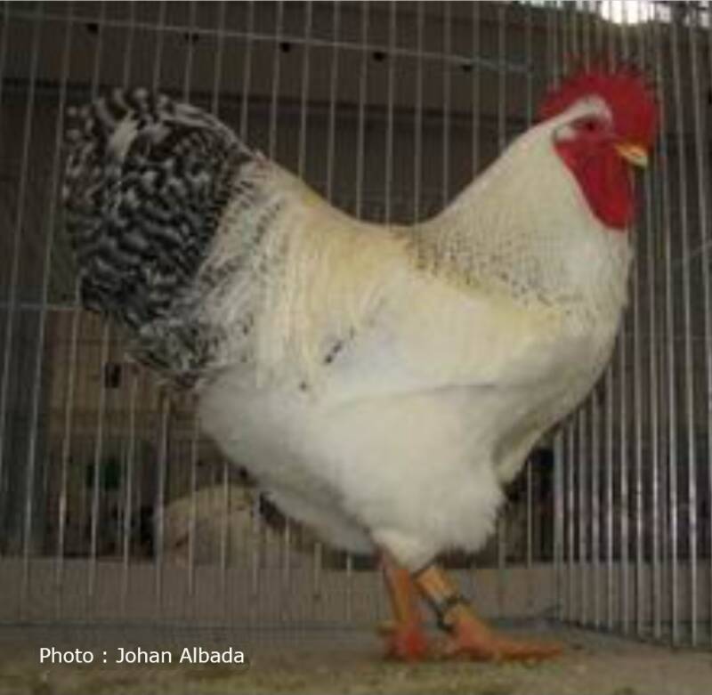 Back and saddle feathers: upper plumage white, between the shoulders below the neck-hackle black and white; saddle-hackle white.