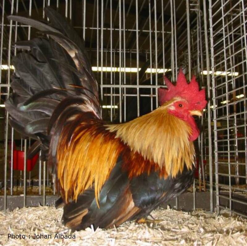 Saddle-hackle: light orange; a slightly deeper shade in the saddle-hackle than in the neck-hackle feathers is permitted, but the greatest possible uniformity in color depth in both feather groups is desirable.